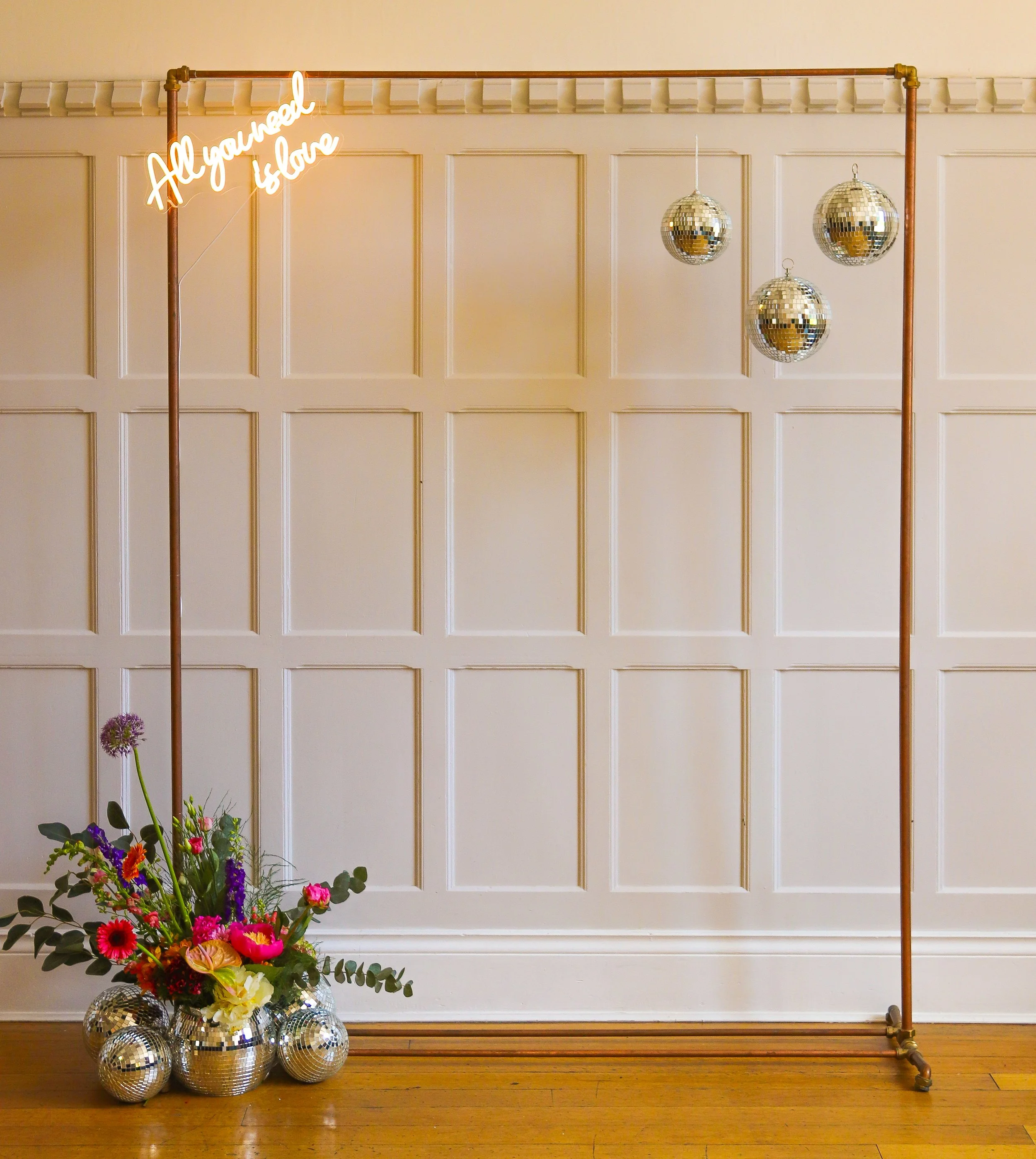 Disco themed wedding at Highley Manor, including disco balls and neon light. Photography by: Gubbins